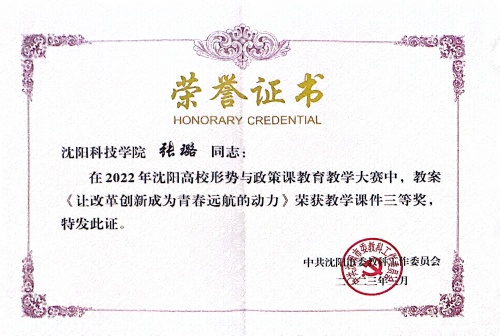 在2022年沈阳高校形势与政策课教育教学大赛中,教案《让改革创新成为青春远航的动力》荣获教学课件三等奖
